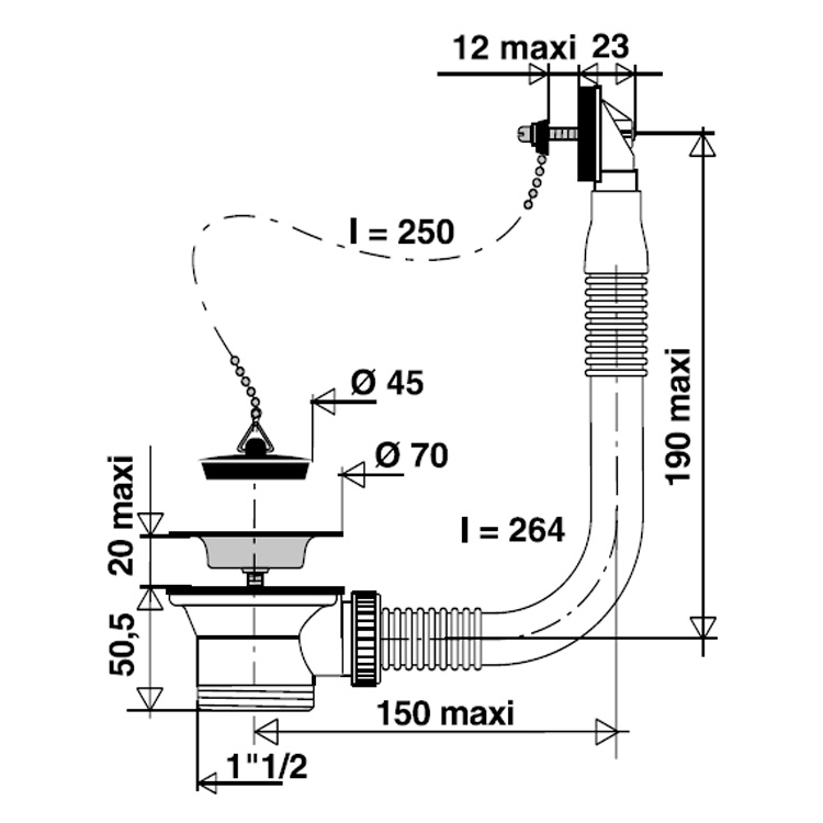 - Bonde à bouchon à trop plein trou Ø 50 évier inox.
