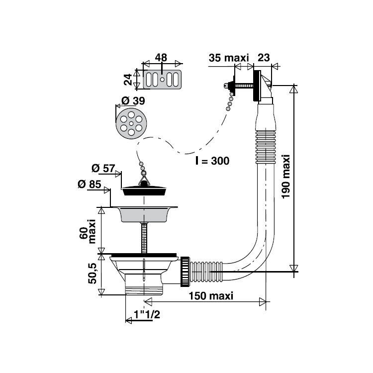 Bonde à bouchon évier Ø 60 avec trop plein